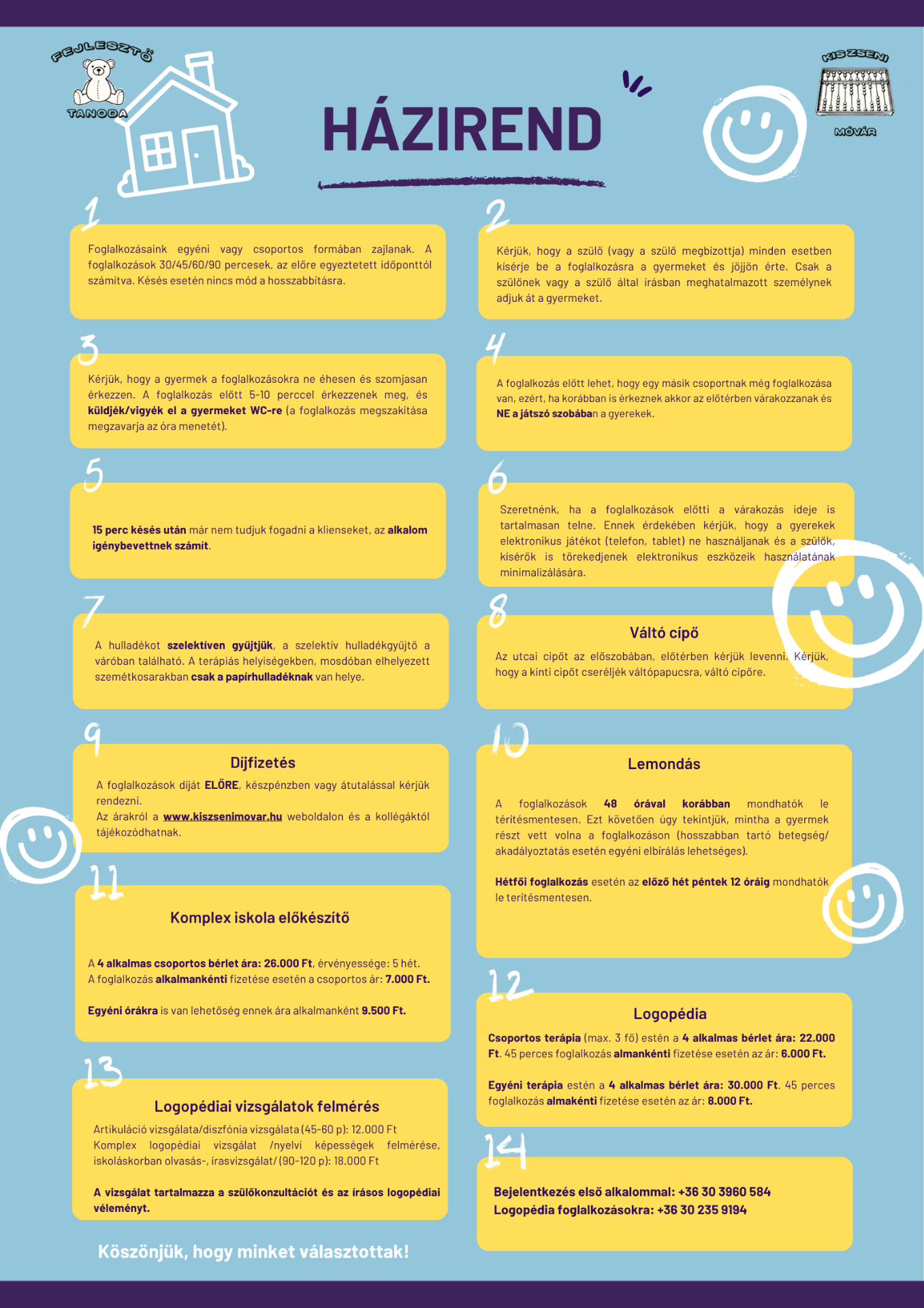 A foglalkozásokra való jelentkezéssel Önök a házirendet és az abban foglaltakat elfogadják. Így kérjük figyelmesen olvassák végig.